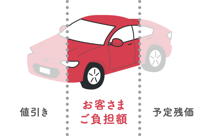車両代から残価やお値引き分を差し引いた価格を、利用期間に応じて分割してお支払いいただく仕組みとなっています。